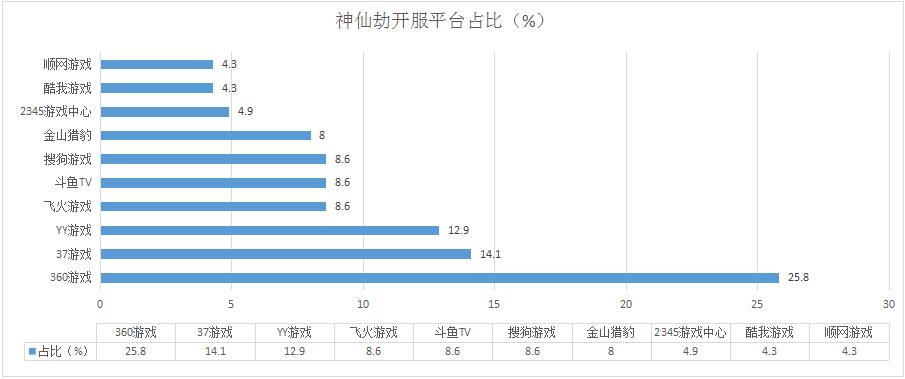 《神仙劫》本周開(kāi)服總數(shù)較上周增漲了9.7%,其在360游戲的開(kāi)服占比高達(dá)25.5%,同時(shí)在酷我游戲、602游戲、酷狗游戲等多個(gè)平臺(tái)的開(kāi)服頻率為1服/天。