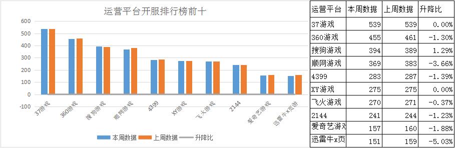 本周各平臺主打游戲開服占比并無太大改變,其中順網(wǎng)游戲《完美紅顏》新晉主打游戲,日均開服3服/天,開服占比5.5%。2144《屠龍戰(zhàn)記》晉升為主打游戲,目前發(fā)展形勢較佳。