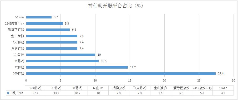 本周《神仙劫》開服總數(shù)增漲9.3%,其在YY游戲開服占比減少1.2%。新增分布占比平臺金山獵豹、2345游戲中心、順網(wǎng)游戲。