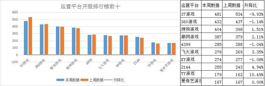 前三位置依舊是37游戲、360游戲和搜狗游戲。順網(wǎng)游戲雖然略有增加開服數(shù),但排名第三的搜狗游戲也增開了幾組,因此排名并未發(fā)生交替。不知道什么時候順網(wǎng)能重回第三,至于第一和第二的寶座,估計短期內(nèi)不會有變動。榜單前三一周開服總計1317組,占一線平臺榜單開服總數(shù)的41.9%,相較上周下降1.4%。