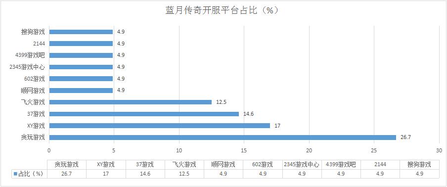 本周《藍月傳奇》開服總數(shù)略有減少,多個平臺開服頻率均保持在2服/天。新增分布占比平臺2345游戲中心、2144。