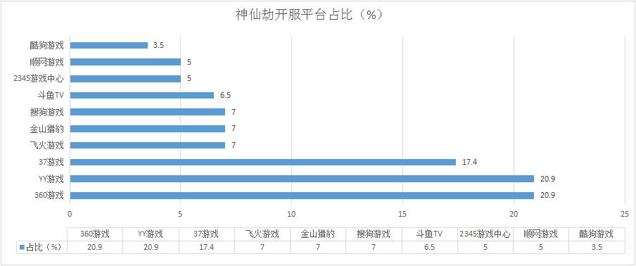 《神仙劫》本周開服略有增漲,YY游戲上調(diào)其開服頻率為6服/天為主要影響因素,其他平臺開服情況未發(fā)生明顯改變。新增分布占比平臺酷狗游戲。