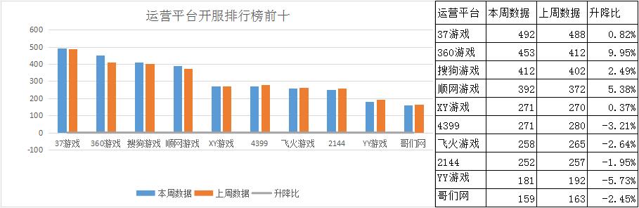 本周前三平臺(tái)開服都有所上升,尤其以360游戲?yàn)樯酰恢茉鲩_服務(wù)器達(dá)41組。而前三平臺(tái)憑借360游戲的發(fā)力,一周開服總數(shù)達(dá)到了1357組,本周總開服數(shù)較上周上升了1%,占一線平臺(tái)前十榜單開服總數(shù)的43.2%。