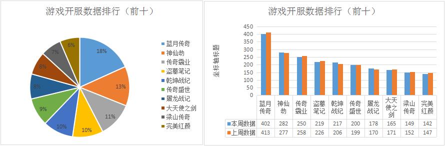 本周榜單游戲開服整體波動(dòng)不大,與上周相比保持穩(wěn)定;其中《屠龍戰(zhàn)記》開服數(shù)較上周增漲4.7%,名次上升一位;《完美紅顏》重回榜單,位列第十。