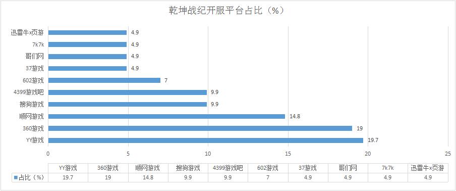 《乾坤戰(zhàn)紀(jì)》本周繼續(xù)維持著良好的發(fā)展態(tài)勢,開服數(shù)增漲了5.3%;新增分布占比平臺(tái)7K7K、迅雷牛X頁游。
