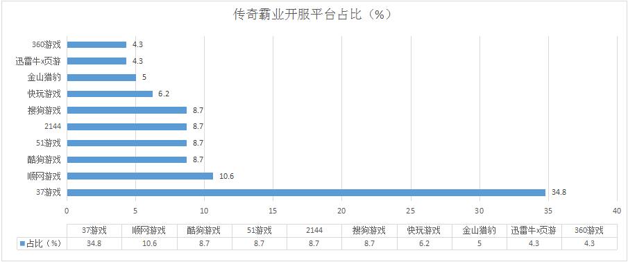 本周《傳奇霸業(yè)》開(kāi)服數(shù)減少了8.6%,其在快玩游戲的開(kāi)服頻率有所下調(diào),其余各平臺(tái)開(kāi)服形勢(shì)相對(duì)穩(wěn)定;新增分布占比平臺(tái)金山獵豹、360游戲。