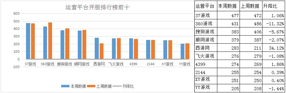 與本周榜單平臺名次也多有變動,西游網(wǎng)憑借兩款主打重推游戲(神印王座、西游之路)躥升至第五,且與排名第三的搜狗游戲僅百服之差。想必搜狗游戲若一直還是減少開服的狀態(tài),西游網(wǎng)兩款主打游戲熱度不減的話,搜狗游戲前三的位置就要不保了。由于西游網(wǎng)火箭躥升,本周YY游戲不幸墊底,同時XY游戲和2144對調(diào),降至第九。一周榜單開服總數(shù)3214組,占一線平臺開服總數(shù)的57.4%,相比上周上升了0.1%,應(yīng)該是漲在西游網(wǎng)身上了。