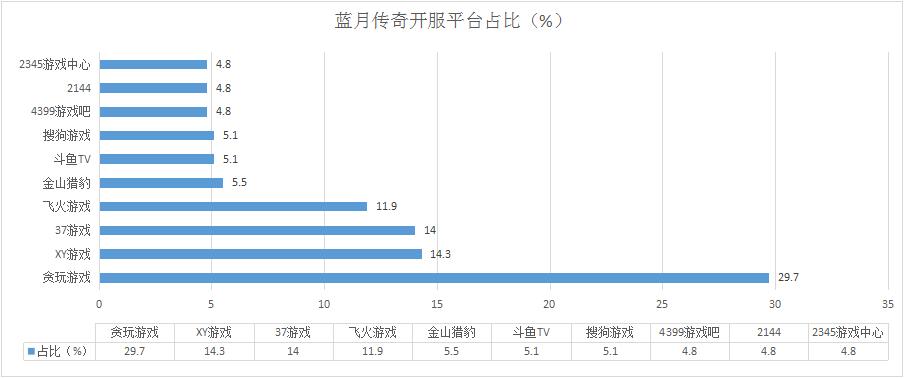 《藍(lán)月傳奇》本周開服總數(shù)略有增加。新增分布占比平臺斗魚TV、2345游戲中心。