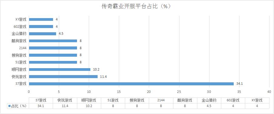 本周《傳奇霸業(yè)》開服漲幅7.3%,其在快玩游戲的開服頻率有所上漲,開服占比11.4%。新增分布占比平臺602游戲、XY游戲,其開服頻率均為1服/天。