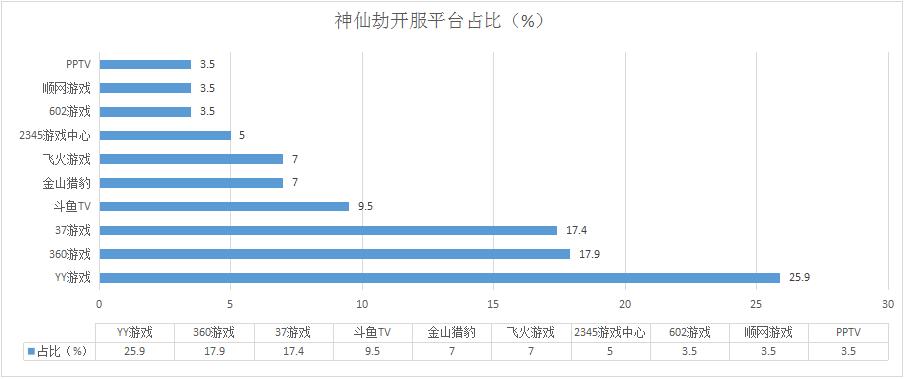 《神仙劫》本周開服總數(shù)略有減少,但整體開服趨勢未變。其在360游戲開服占比下降1.8%。另有多個平臺保持1服/天的開服頻率。新增分布占比平臺PPTV。