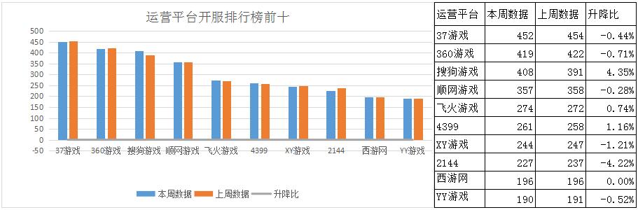 本周各運(yùn)營(yíng)平臺(tái)主打游戲開(kāi)服情況較上周變化不大;其中37游戲上調(diào)主打游戲《大天使之劍》的開(kāi)服頻率為9服/天?!豆ド场贰ⅰ秳b情緣兵器譜》則新晉為360游戲主打產(chǎn)品,開(kāi)服占比分別為6.7%、5.5%。
