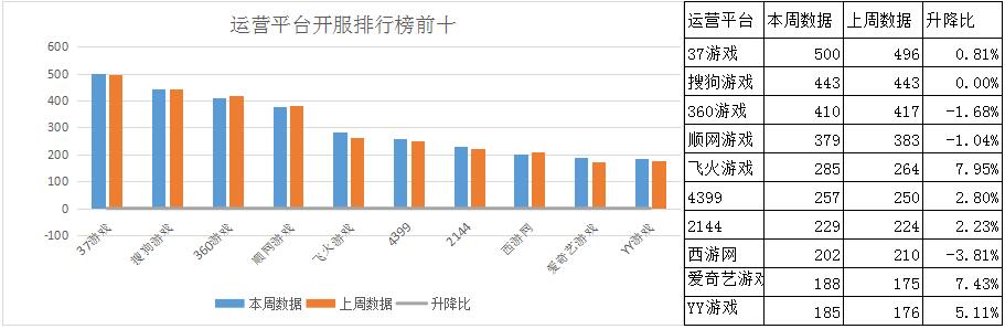 本周各運(yùn)營平臺主打游戲開服情況基本未發(fā)生改變,37游戲下調(diào)西游伏妖篇開服數(shù),藍(lán)月傳奇重回37主打游戲地位。順網(wǎng)游戲本周主推《神途》為第一主打游戲,日均開服頻率4服/天。愛奇藝游戲《楚喬傳》晉升為主打游戲,開服占比4.3%。西游網(wǎng)下調(diào)了西游之路開服數(shù),略微上調(diào)了完美紅顏開服數(shù),使其超越魔法王座重回西游網(wǎng)主力地位。