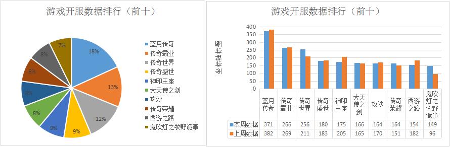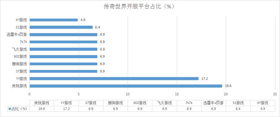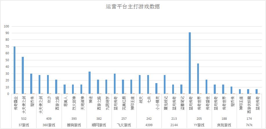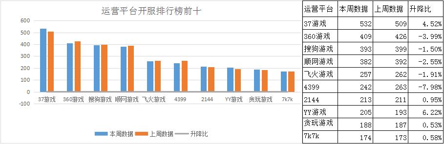 本周各運(yùn)營平臺(tái)主打游戲開服情況較上周變化不大,順網(wǎng)游戲《神印王座》重回主打游戲之列,開服頻率3服/天;YY游戲則將《傳奇世界》推為平臺(tái)第一主打游戲,開服頻率達(dá)到5服/天。