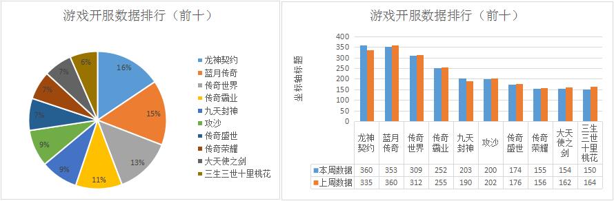 本周游戲開服榜單中,龍神契約繼續(xù)高歌猛進。藍月傳奇常年霸占的第一寶座本周終于交到了龍神契約手中。傳奇世界似乎有些后期乏力,在經歷過剛上線那一段時間的爆發(fā)式增長之后,現(xiàn)在整個開服節(jié)奏已經漸漸穩(wěn)定下來。似乎市場給的反饋不是太好,傳奇世界這個超級IP大作現(xiàn)在的開服已經基本停止了增長。九天封神本周發(fā)展態(tài)勢也非常不錯,開服總數(shù)上升13組,排名在第五位。