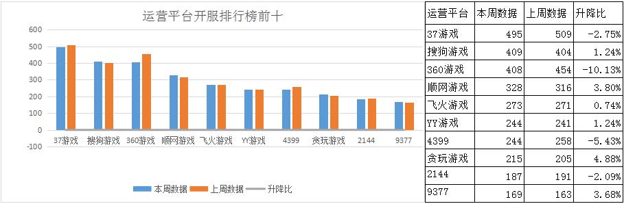 本周各運營平臺主打游戲發(fā)生變化不大,在開服數(shù)量上有小幅的調(diào)整。其中360游戲主打的龍神契約下調(diào)較為明顯,本周開服數(shù)下降至10服/日,較上周減少開服2服/日;修仙記也有所調(diào)整,減少了7組服務器;YY游戲《刺秦秘史》、《魔域永恒》開服頻率均調(diào)整為4服/天;9377本周開服策略以傳奇類產(chǎn)品為主,主打游戲《攻沙》目前開服頻率為8服/天,開服占比31.4%。