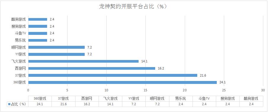 本周《龍神契約》開服總數(shù)減少7.7%。其在360游戲開服占比為24.1%,較上周減少2.6%。受360開服策略調(diào)整的影響,龍神契約本周開服下降趨勢較為明顯,同時也失去了第一的寶座。新增分布占比平臺酷狗游戲,日均開服1服/天。
