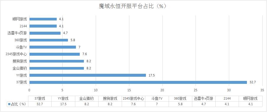 《魔域永恒》本周開服較上周略有減少,其在迅雷牛X頁游開服頻率調(diào)整為1服/天。37游戲開服占比升至32.7%。