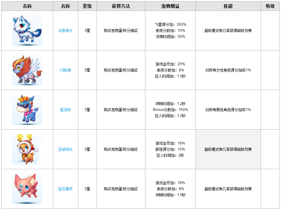 天天酷跑寵物大全 寵物屬性一覽