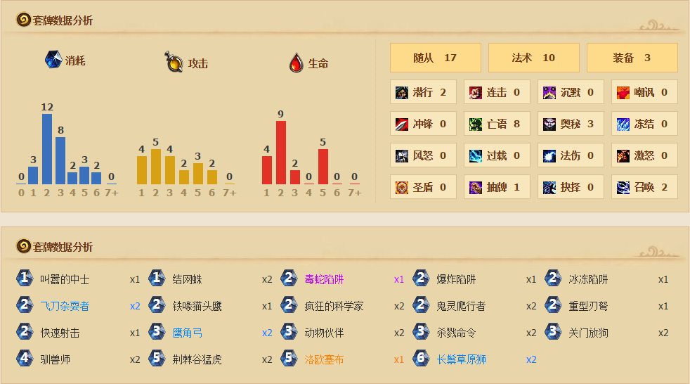 今天我們帶來的是TuckFrump的中速獵套牌。這套牌雖然結(jié)構(gòu)和傳統(tǒng)中速獵類似,然而在關(guān)鍵牌的選擇上卻有些不同。這套牌更具進攻性,在很多時候你可以選擇直接打臉,這讓你能偷得很多對局的勝利。另外,這套牌有很多野獸,這樣你就可以用兩張馴獸師。雖然這只是一個小變化,但是實際上這讓中速獵的穩(wěn)定性大增,更有助于爬天梯。