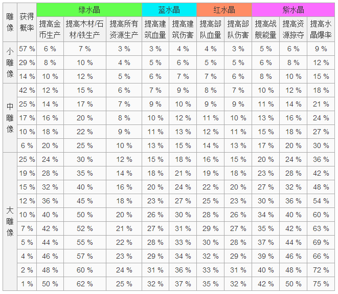 3、藍(lán)色雕像:藍(lán)色代表寒冰,藍(lán)色水晶可以合成出防御類相關(guān)的雕像,效果主要是按百分比增加我方防御設(shè)施(含我占領(lǐng)的資源島)的生命值和攻擊力。