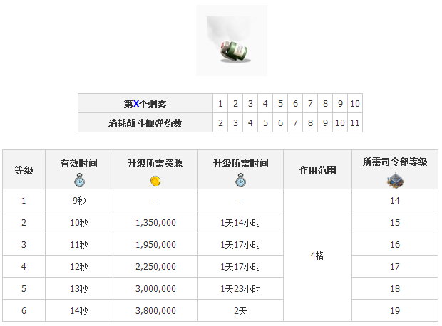 1、煙霧彈升級(jí)詳細(xì)數(shù)據(jù):