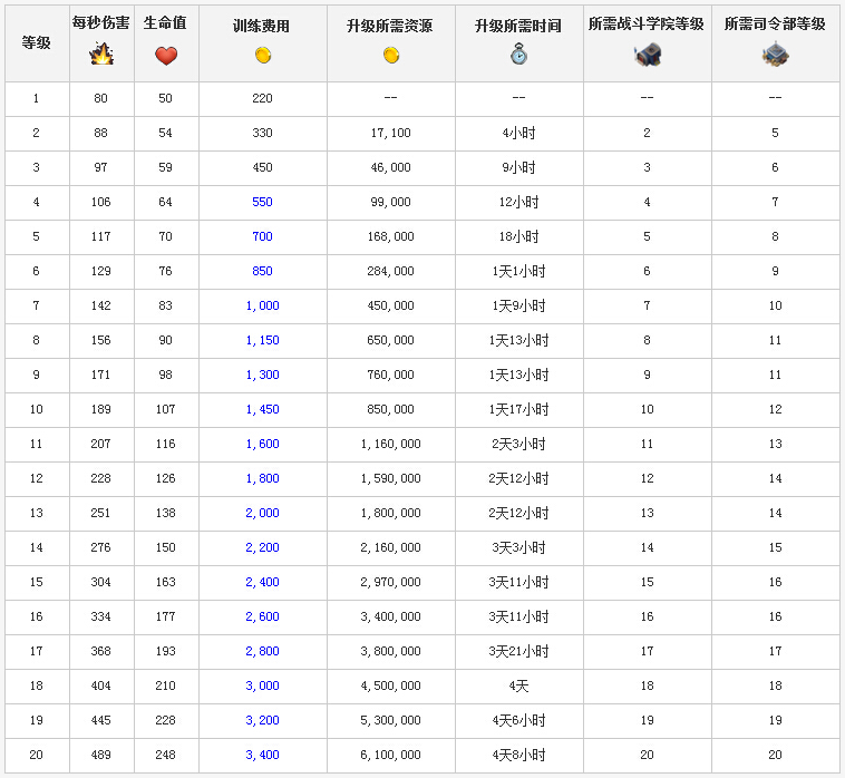 1、火箭炮兵升級(jí)詳細(xì)數(shù)據(jù):